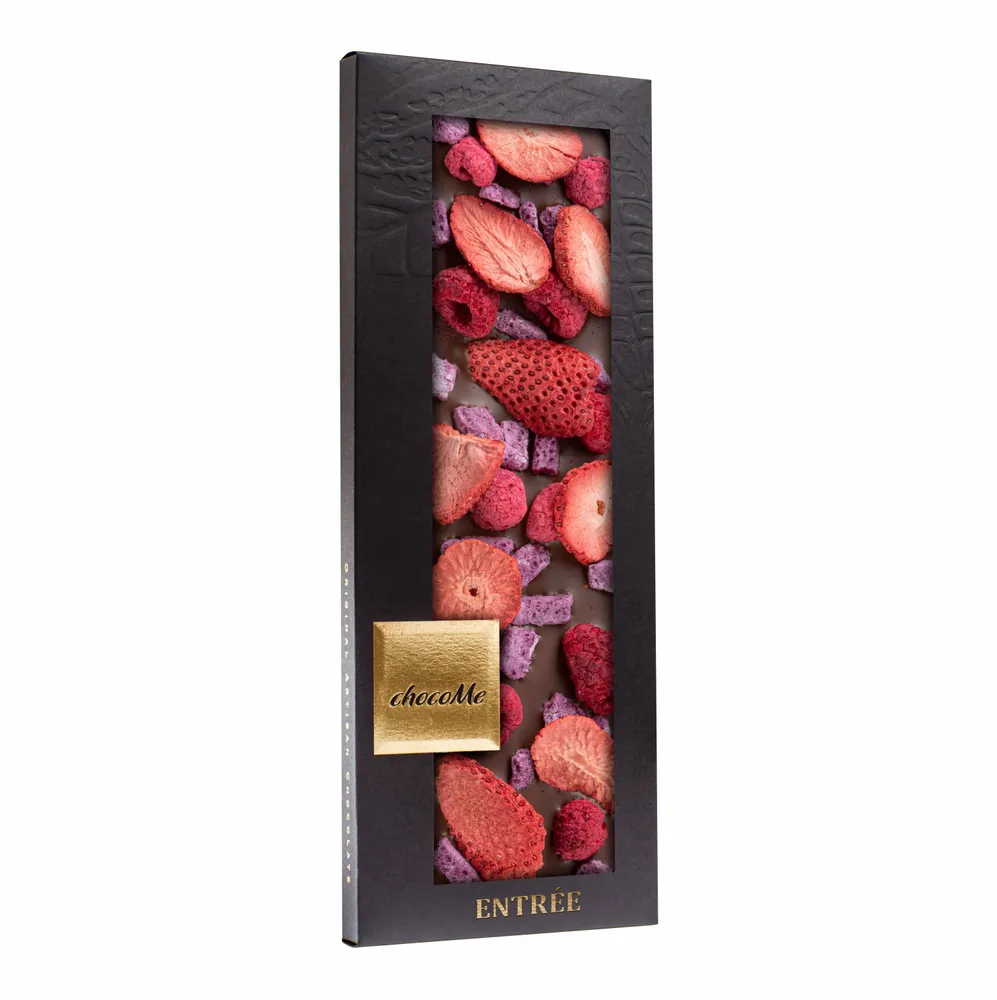 Состав: молочный шоколад 41%, сублимированная клубника, сублимированная малина, йогурт из сублимированной голубики.